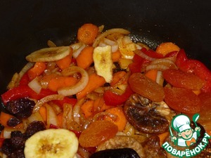 [+5]Готовила из голеней (сорри, но они наполовину дешевле), солила их после жарки, сухофрукты - только курага и чернослив, перца - 1 шт. Очень понравилось сочетание овощей и сухофруктов + мясо. Нам даже гарнира не понадобилось, настолько вкусные сочетания!!!
