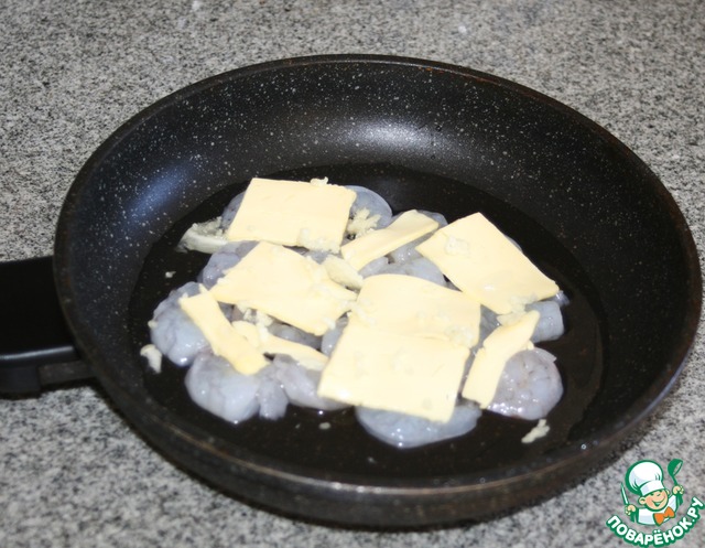 Далее подготовим креветки. Берем сковороду, выкладываем креветки, сверху тонкими ломтиками сливочне масло, сверху давленый чеснок и 4 ст. л. воды. Накрываем крышкой и на маленький огонь на 5-7 минут до готовности креветок. Кстати, отличая закуска)).