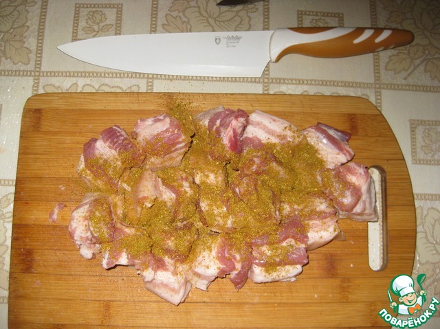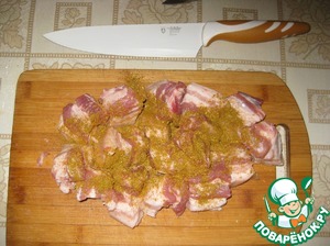 Нарезаем свинину средними кусочками, добавляем хмели-сунели и соль.