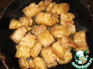 Обжариваем на сильном огне постоянно переворачивая кусочки.
