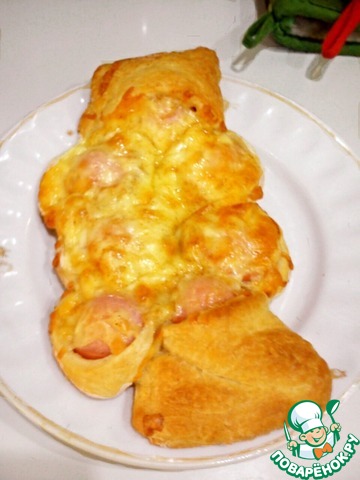 каждую савёрнутую сосиску надрезали ножом до шва на 6 частей и в шахматном порядке разложили каждый кусочек, как на фото.