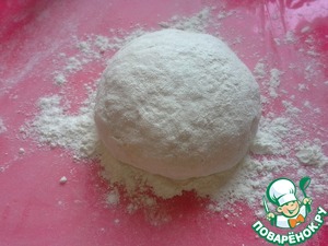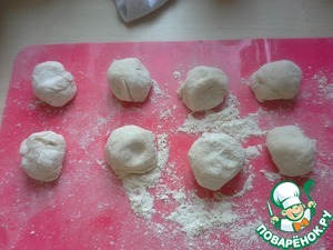 Тесто делим на 8 одинаковых частей, скатываем в шарики. Затем каждый шарик на присыпанной мукой поверхности раскатываем в тонкий круг, диаметром примерно 13 см и толщиной 1-2мм.