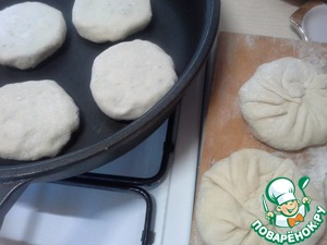 В центр каждого круга выкладываем 2 ст. л. начинки и собираем края лепешки по кругу в мешочек, формируем круглый пирожок. Таким же образом формируем все наши мини-кутабы. Хорошо разогреваем сухую сковородку, желательно чугунную или с толстым дном, и обжариваем каждый пирожок (безо всякого масла) с каждой стороны по 4-5 минут.