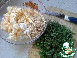 Тем временем приготовим начинку. Сначала поджарим на маленькой сковородочке яйца, если вареные, то мелко порубим. Мелко рубим зелень, смешиваем с тертым сыром, творогом, рублеными орехами и яйцами. Солим, перчим и хорошо перемешиваем.