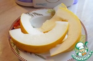 Дыню вымыть, порезать на дольки, очистить от корки.