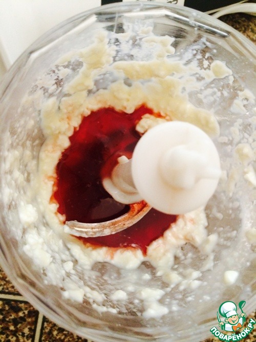 Вместо сока вишни я взяла свежую клубнику и с творгом измельчила блендером. И был только мед, без сгущенки. Молоко взбивала специальным миксером для пены, которым для капучино и латте молоко делают.