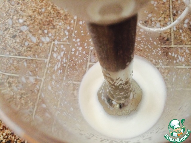 Помещаем в удобный сосуд и начинаем взбивать теплое молоко погружным блендером (не миксером). Максимальная мощность, примерно 1 минуту взбиваем.