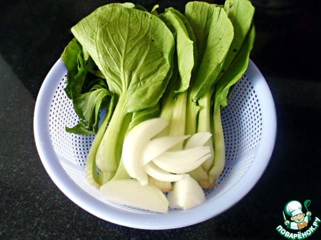 Шпинат промыть под холодной водой. Половину луковицы разрезать на 4 части. Лук и шпинат ошпарить кипятком.