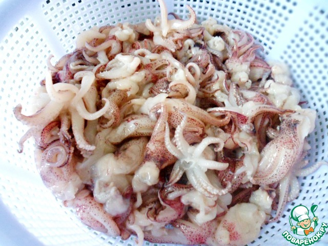 Размороженные морепродукты - креветки, кальмары или осьминожки как у меня- также ошпарить кипятком и оставить стекать.