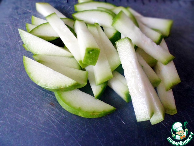 Цуккини нарезать полосками. На сковороде или в воке разогреть растительное масло.