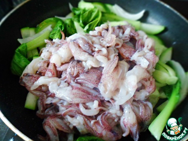 Морепродукты, с которых полностью стекла вода, добавить к овощам, встряхнуть, жарить на сильном огне буквально 1 минуту. Снять с огня. Т. е. вкупе овощи и морепродукты должны готовиться не дольше 3 минут, поэтому делать приходится все очень быстро.