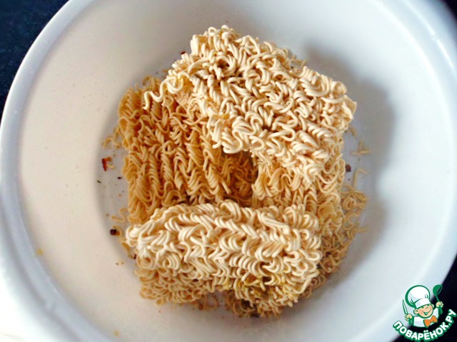 Лапшу быстрого приготовления поломать на 2 части, залить кипятком на 1 минуту.