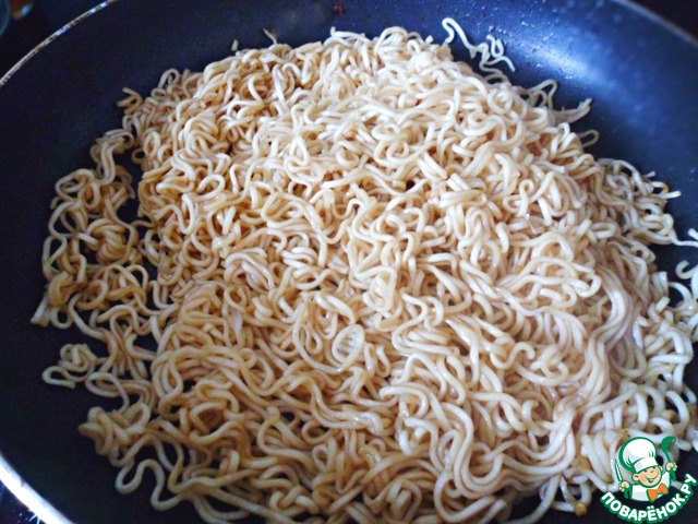 Откинуть лапшу на дуршлаг, она должна быть еще твердоватой. В другой сковороде на раскаленном масле обжарить лапшу в течение пары минут с добавлением соевого соуса.