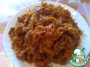Теперь нужно соединить обжаренную капусту с баклажанами, посолить по вкусу, добавить томатную пасту, немного разведённую водой и специи по вкусу. Тушить под крышкой ещё 15-20 минут.