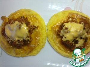 Сверху на готовые лепёшки выкладываем начинку и посыпаем натёртым сыром. Снова ставим в духовку на 10 минут.