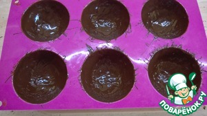На силиконовые полусферы при помощи кисточки нанесите по стенкам первый слой шоколада. Охладите. Затем нанесите второй слой растопленного шоколада. Снова охладите.