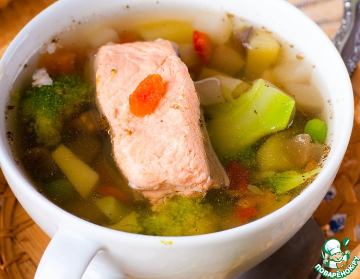 10. Разлейте уху по глубоким тарелкам, добавьте в каждую порцию ухи кусочки сёмги, приправьте долькой лимона и подавайте к столу.