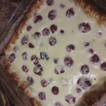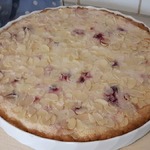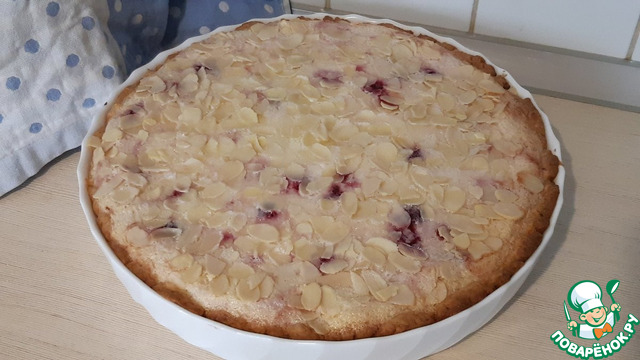 Распределить на тесто вишню и залить сметанной заливкой, обильно посыпать миндальными лепестками. -