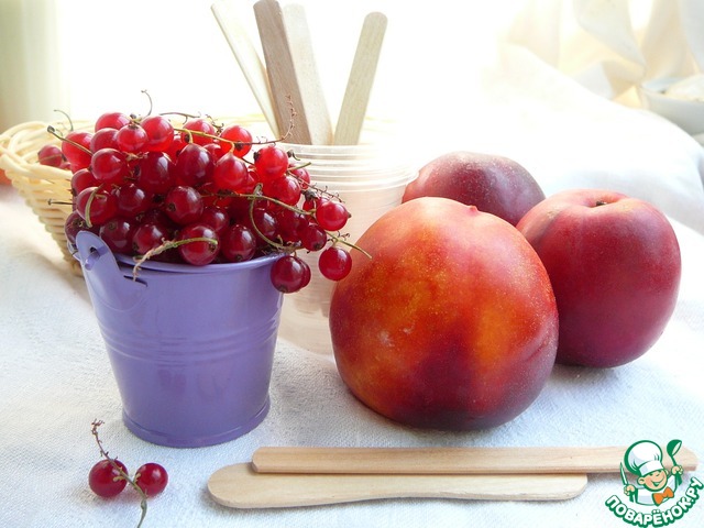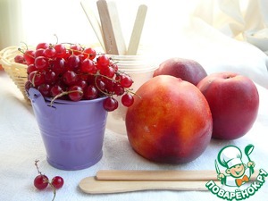 Практически все свежие фрукты-ягоды подойдут. Я остановила свой выбор на смородине и персиках. Мои помощники - пластиковые стаканчики и деревянные палочки для мороженого.