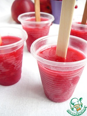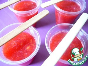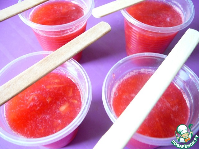 Соединила все ингредиенты. Разлила по стаканчикам и отправила их в морозилку. Минут через 10-15 воткнула палочки и до полной заморозки.