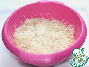 Тертый на мелкой терке сыр и замешиваем тесто. Один желток оставляем на смазку полосок.