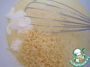 Добавим сметану и тёртый сыр, всё перемешиваем.
