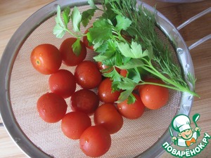 Помидорки-черри и зелень моем-сушим. Зелень мелко рубим - у меня петрушка и укроп.