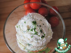 Приготовим начинку для помидор: чеснок и пармезан трём на мелкой тёрке, смешиваем их с творогом, добавляем зелень и столовую ложку яичного белка, чтоб связать начинку.