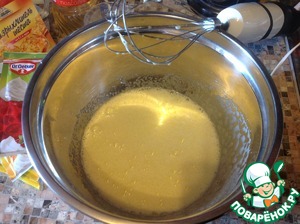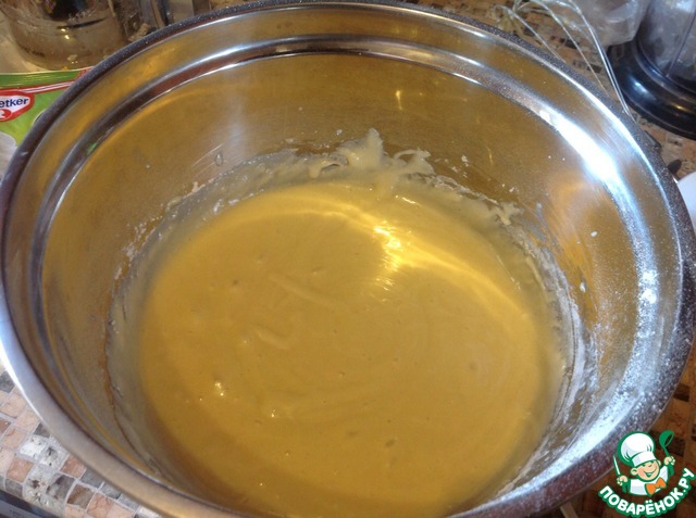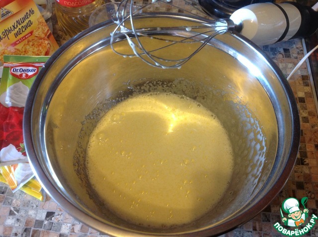 Добавляем просеянную муку с разрыхлителем, молоко, подсолнечное масло. И замешиваем тесто до густоты сметаны.