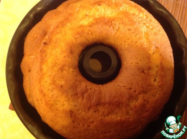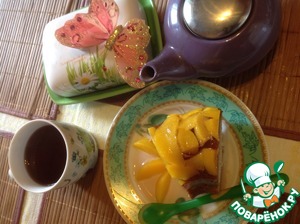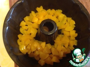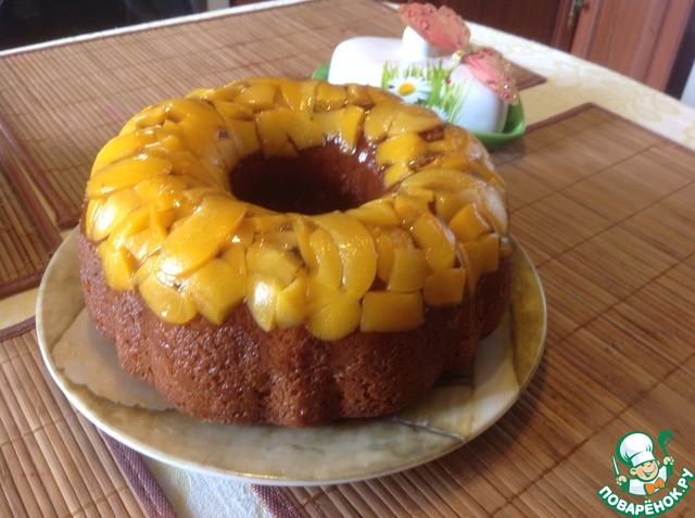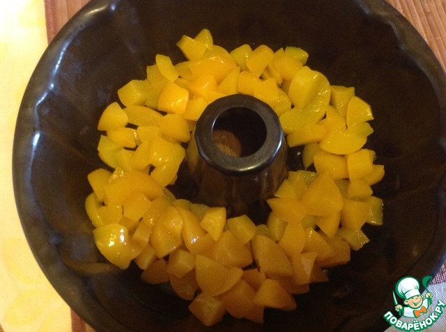 Кладем его на персики. Разводим оставшиеся 3 упаковки желе по той же технологии, остужаем и заливаем кекс. Ставим в холодильник на несколько часов, пока желе не застынет. У меня стоял ночь. Достаем из формы (опустить форму на минутку в горячую воду) и...