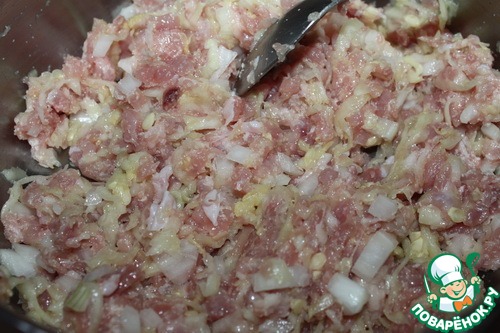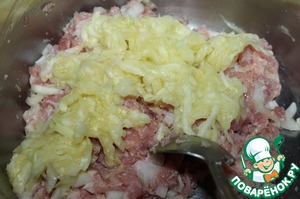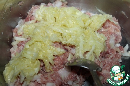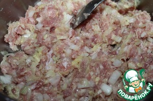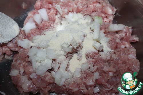 Луковицу мелко нарезать (или прокрутить на мясорубке). Добавить вместе с манной крупой к фаршу.