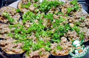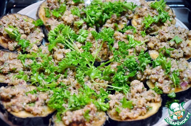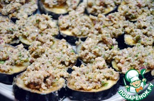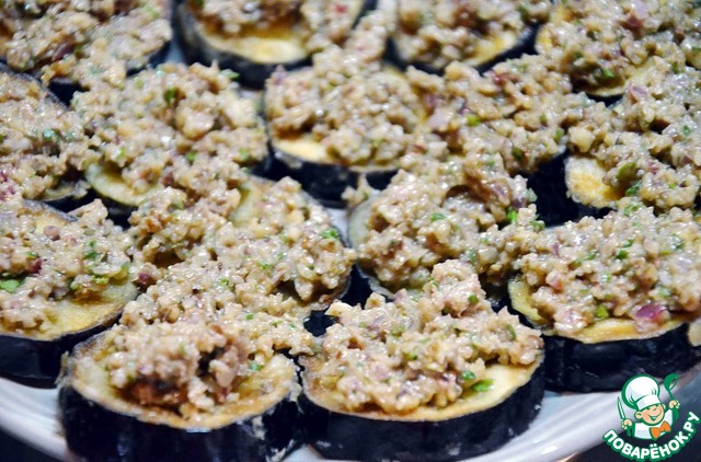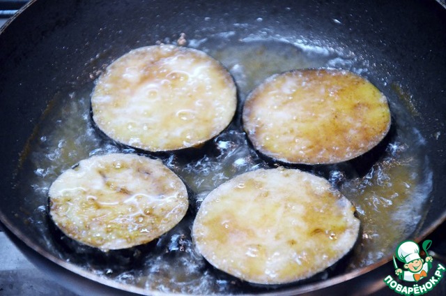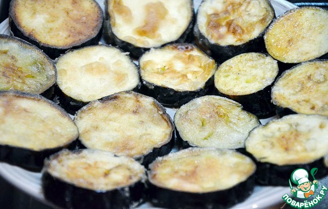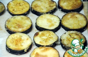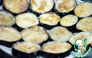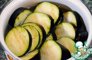 Баклажаны нарезать кружками толщиной 1 см. и оставить в соленой воде на 20 минут