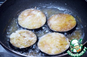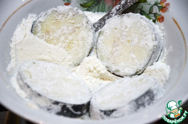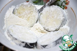 Муку смешать с 1 ч. л. соли. Обвалять кружки баклажана в мучной смеси.
