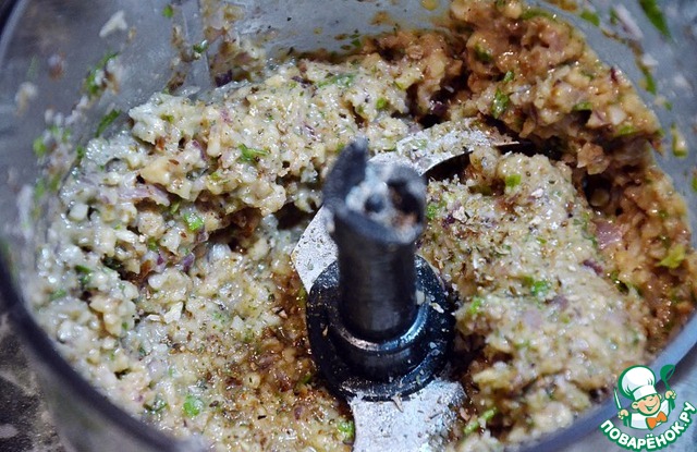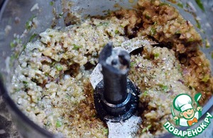 Приготовим заправку: орехи, лук-шалот, чеснок измельчить в блендере в импульсном режиме, чтобы соус получился с фактурными кусочками. Добавить лимонный сок, 100 мл. оливкового масла, петрушку.