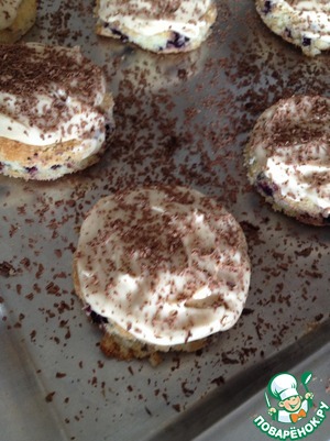 • Готовый корж достаем из духовки, переворачиваем его. И с помощью стакана вырезаем кружочки для основы пироженных.