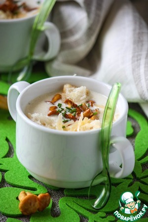 Готовый суп разлить по тарелкам, добавить отложенные ранее лисички, немного тертого сыра, чесночные гренки и посыпать свежей зеленью (лук/шнитт-лук/укроп/ петрушка).