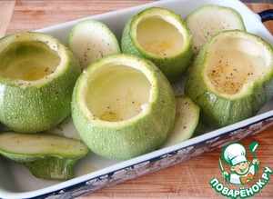 Подготовить кабачки. Срезать крышечки (либо разрезать вдоль пополам) и аккуратно выбрать мякоть ложкой, оставляя небольшие стеночки.