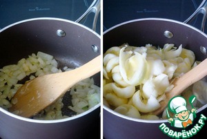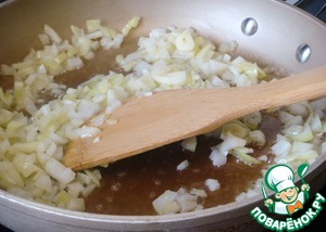 На хорошо разогретой сковороде на смеси сливочного и оливкового масла спассеровать лук и чеснок в течение 2-3 минут.