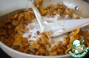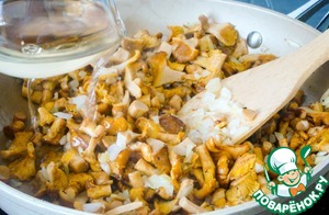 После выпаривания вина отложить часть (1/3) обжаренных лисичек для супа. Сохранять теплыми. -
