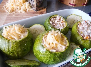 Цукини извлечь из духовки и начинить получившейся сливочно-грибной начинкой, присыпать каждый кабачок тертым сыром (можно использовать твердый типа голландского/пармезан, а для гурманов - даже бри). Кабачки снова отправить в духовку еще на 5-10 минут до расплавления и зарумянивания сыра.