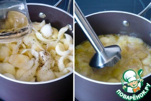 Добавить соль и перец, влить и выпарить вино (100мл). Накрыть крышкой и потушить около 10 минут до размягчения кабачков. Я не добавляю воду, т. к. молодые кабачки дают много сока, а также остается жидкость от выпаренного вина. После того, как кабачки размягчатся - пюрировать содержимое кастрюли погружным блендером до однородного состояния (либо воспользоваться стационарным).