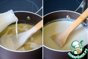 Параллельно, пока готовятся кабачки, я готовлю суп-пюре из оставшейся мякоти. Для этого: в глубокой кастрюльке спассеровать на смеси оливкового и сливочного масла отложенный лук и чеснок. Добавить мякоть кабачков, обжарить на слабом огне все вместе еще 2-3 минуты, помешивая.