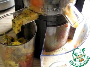 Пропустить по очереди через соковыжималку. ***Листики мяты я не обрывала, положила прямо с веточками, все отлично прошло, сок отжался, а жмых почти сухой.
