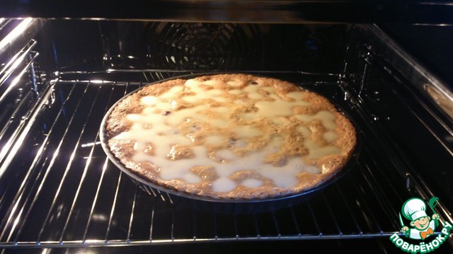 • За 5 минут до готовности (примерно, конечно же) ложкой аккуратно по всему пирогу поливаем заливкой.