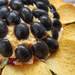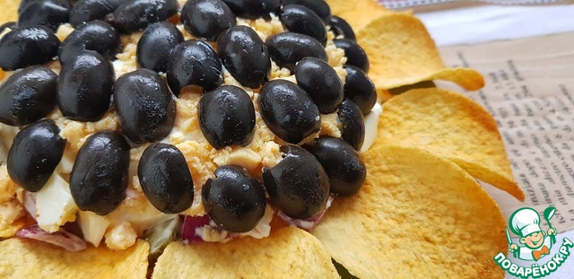 Оформление: по краю салата выложить чипсы - это листики, на тертый желток наносим майонезную сетку (горизонтально и вертикально), в полученные ячейки уложить маслины (нарезанные кружочками).