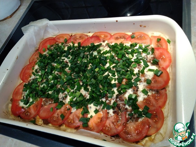 Готовый пирог я щедро посыпала зеленым луком и возле бортиков выложила кусочки помидора. Вам советую поступить так же, поскольку лук даст прекрасное дополнение ко вкусу, а свежий помидор - дополнительную сочность.