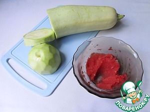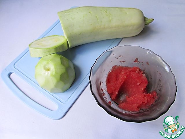 Отрезаем от кабачка стограммовый кусочек и очищаем его от кожуры. Вместо кабачка можно использовать цуккини.