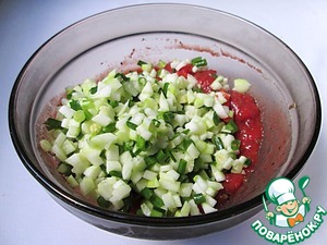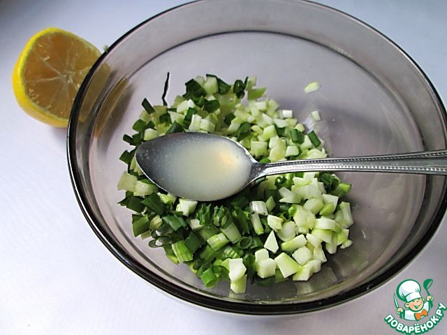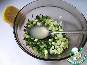 Кабачок режем мелкими кубиками, также мелко нарезаем зеленый лук. Перемешиваем с 1 ст. л. лимонного сока.