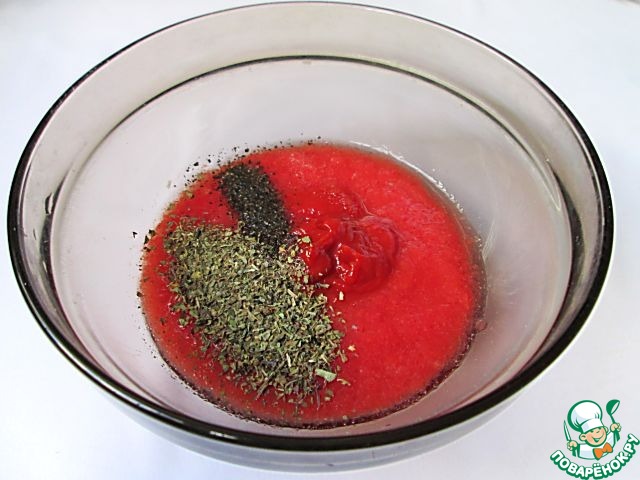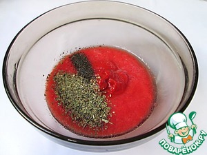 К томатному соку добавляем специи и томатную пасту. Из специй я брала сушеный базилик, паприку, черный перец и острый красный перец. Добавляем сахар и солим по вкусу.