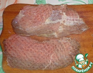 Мясо разрезаем на две части. Солим и перчим по вкусу, отбиваем немного.